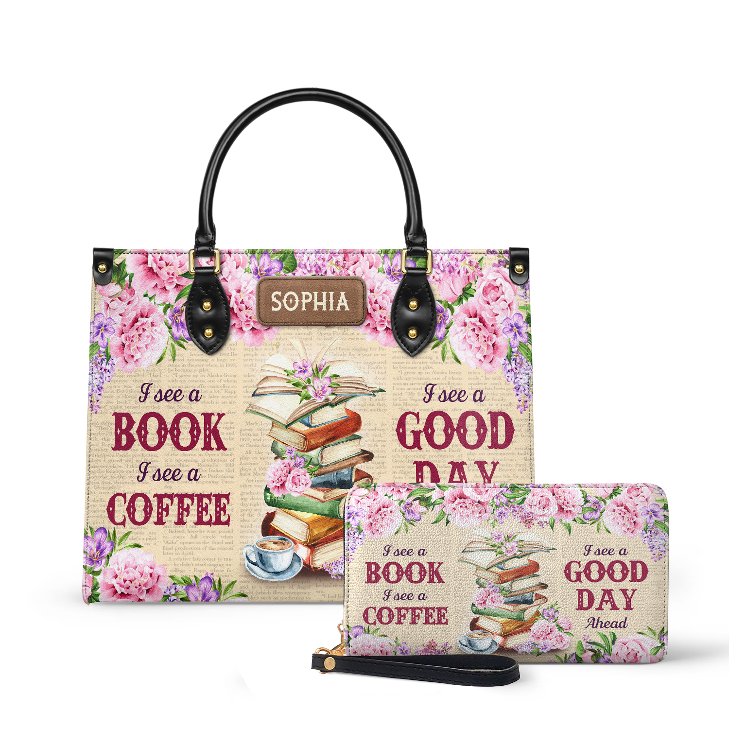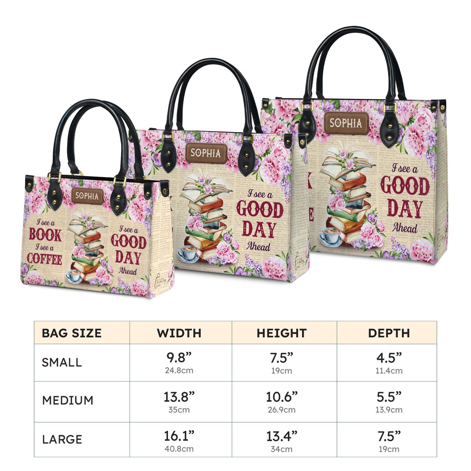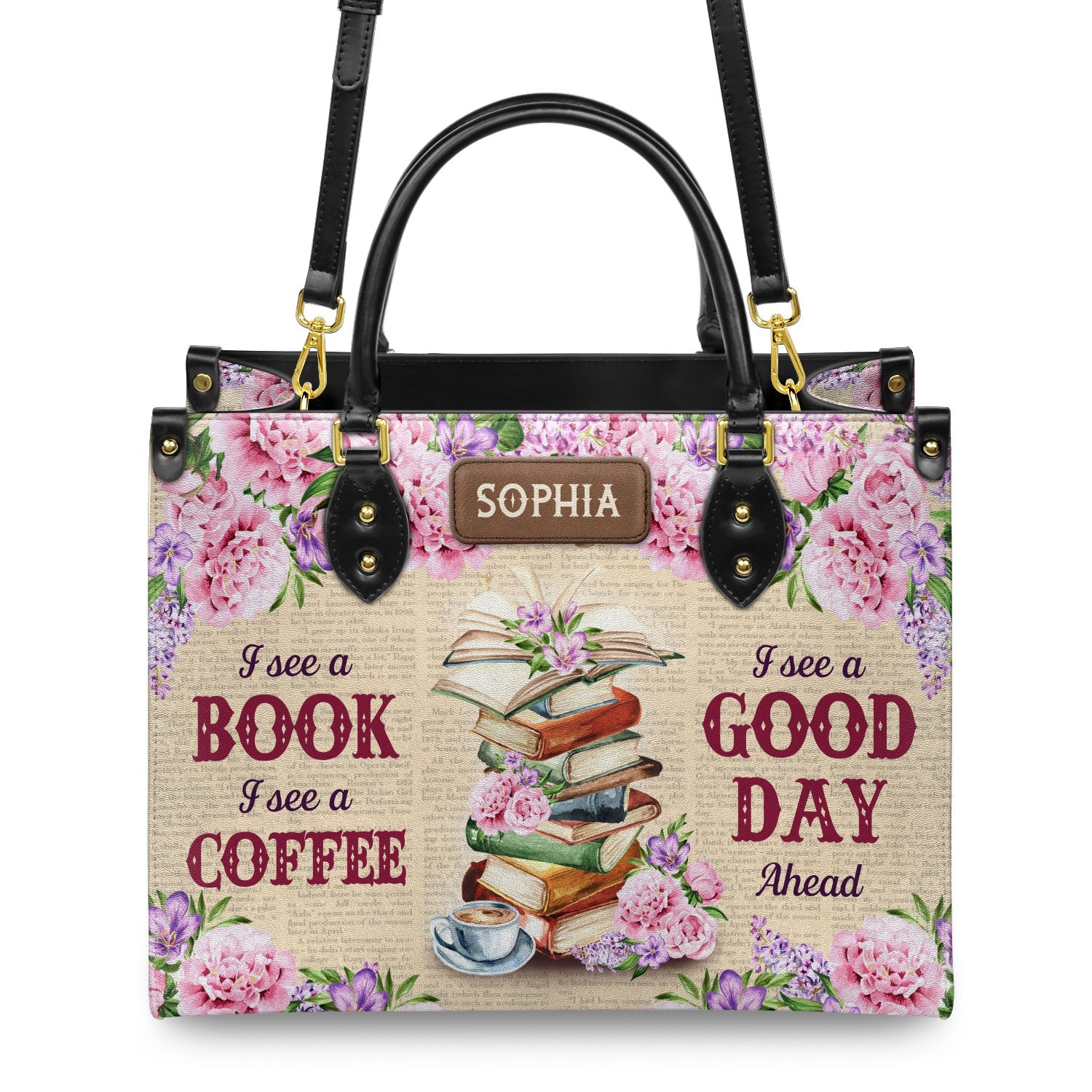 This leather bag has “I See A Book I See A Coffee I See A Good Day Ahead” printed on both sides. If that line speaks to you, this bag was made with you in mind.