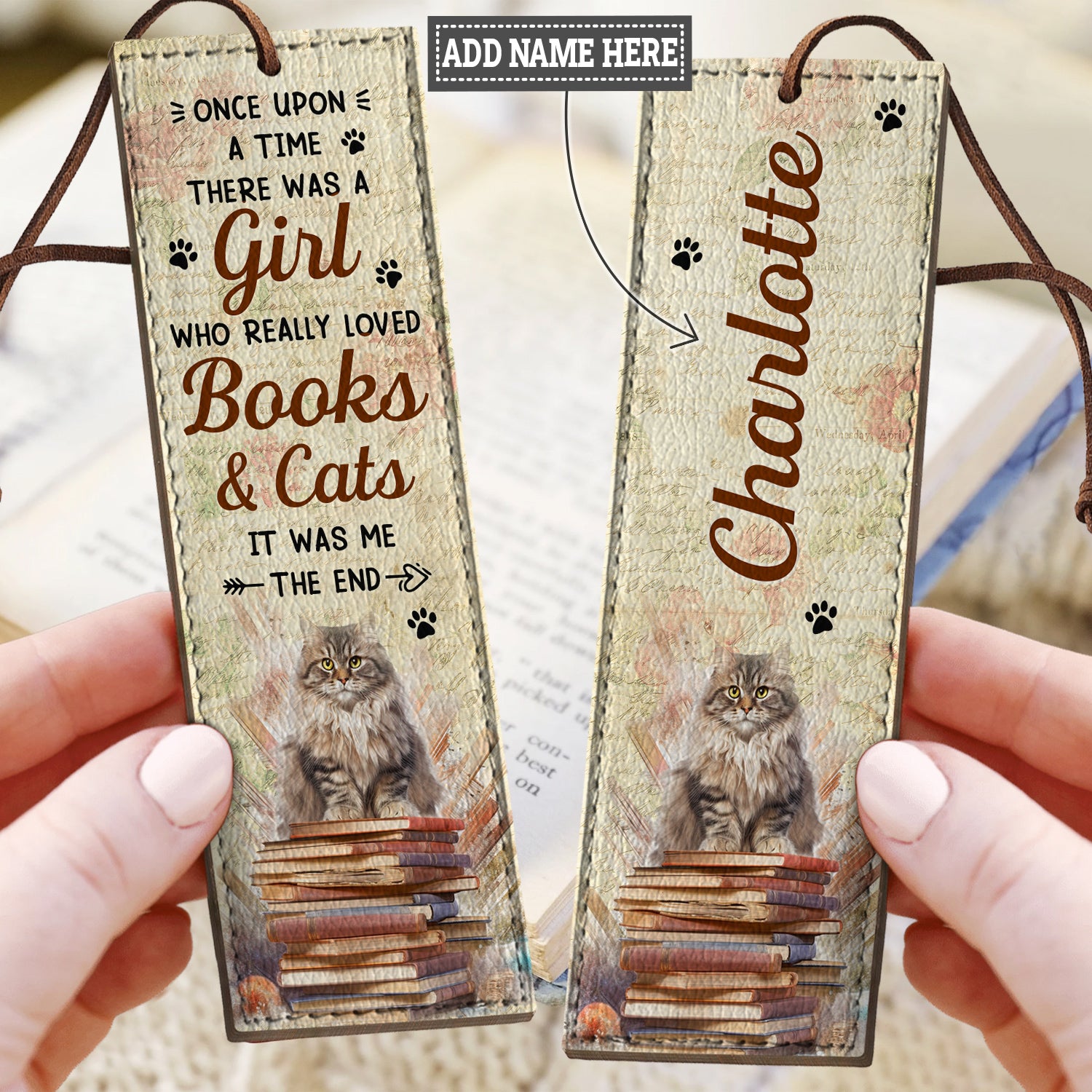 A handmade leather bookmark with “Just a girl who loves books and cats” on it. Genuine leather, good weight in the hand, and it sits flat in the pages without leaving marks. The kind of bookmark you actually want to use, not just shove in a drawer.