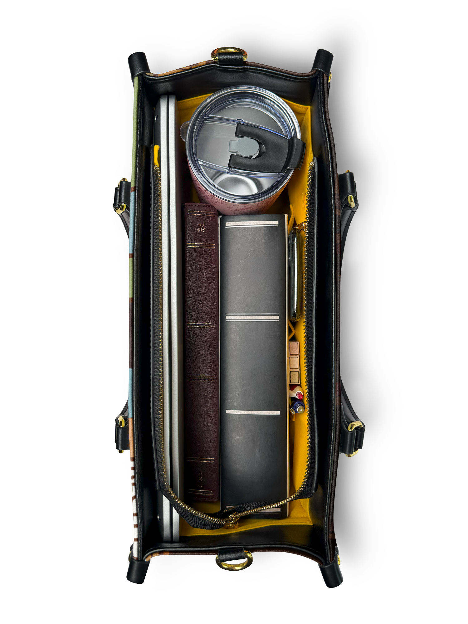 It comes in premium faux leather or top-grain leather, in Small, Medium, and Large. The leather has a grained texture with contrasting color details on both sides. You get shoulder straps and rolled leather top handles, so you can carry it however works for you.