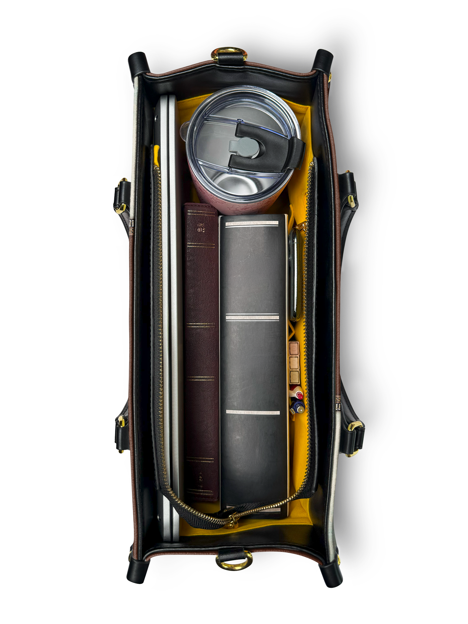 It comes in premium faux leather or top-grain leather, in Small, Medium, and Large. The leather has a grained texture with contrasting color details printed on both sides. You get shoulder straps and rolled leather top handles, so you can carry it however works for you.