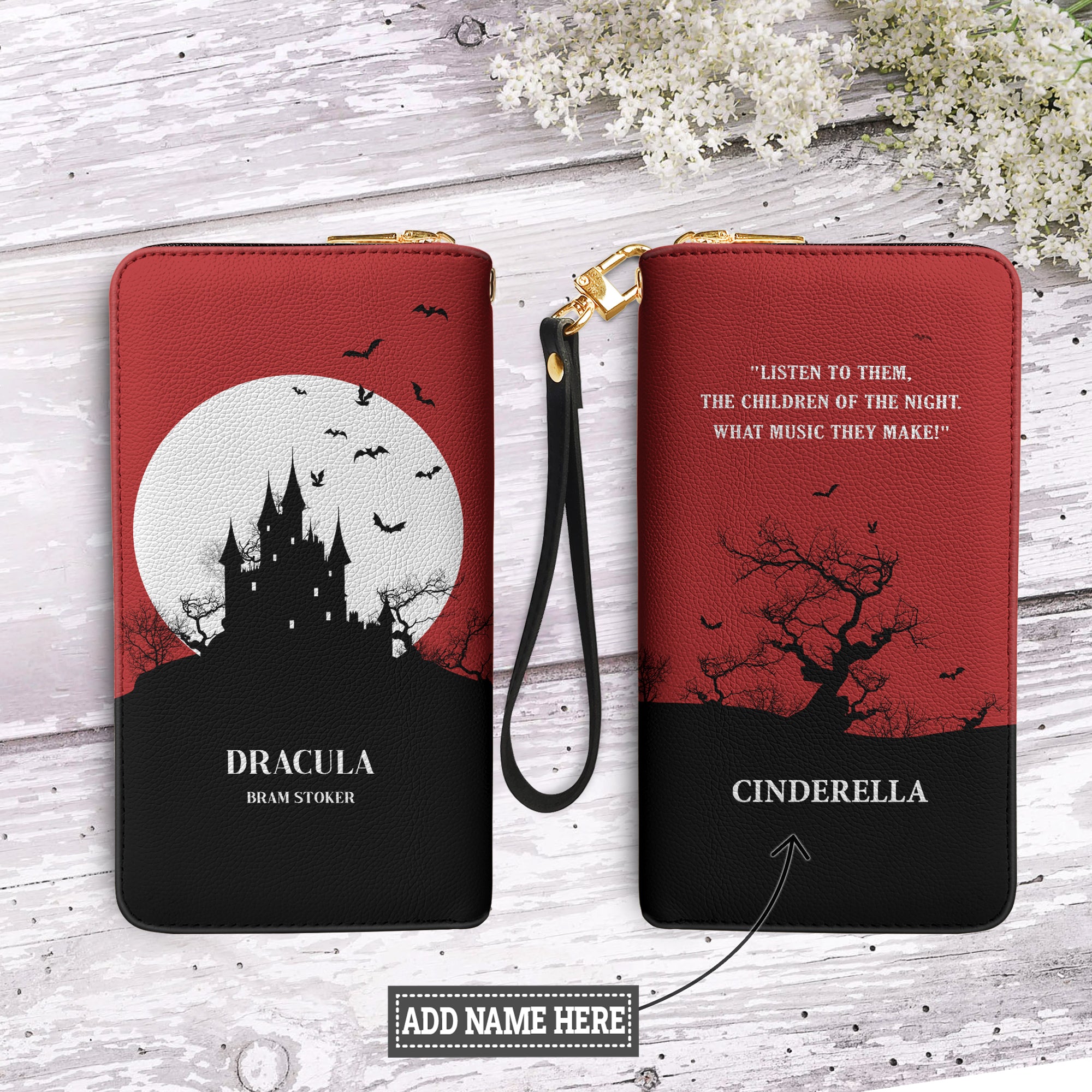 Zip-around leather wallet with “Dracula Bram Stoker” on the front. Top grain leather or premium faux leather. 8 card slots, coin pocket, bill pockets, and wristlet strap. 4.3 x 7.8 inches.