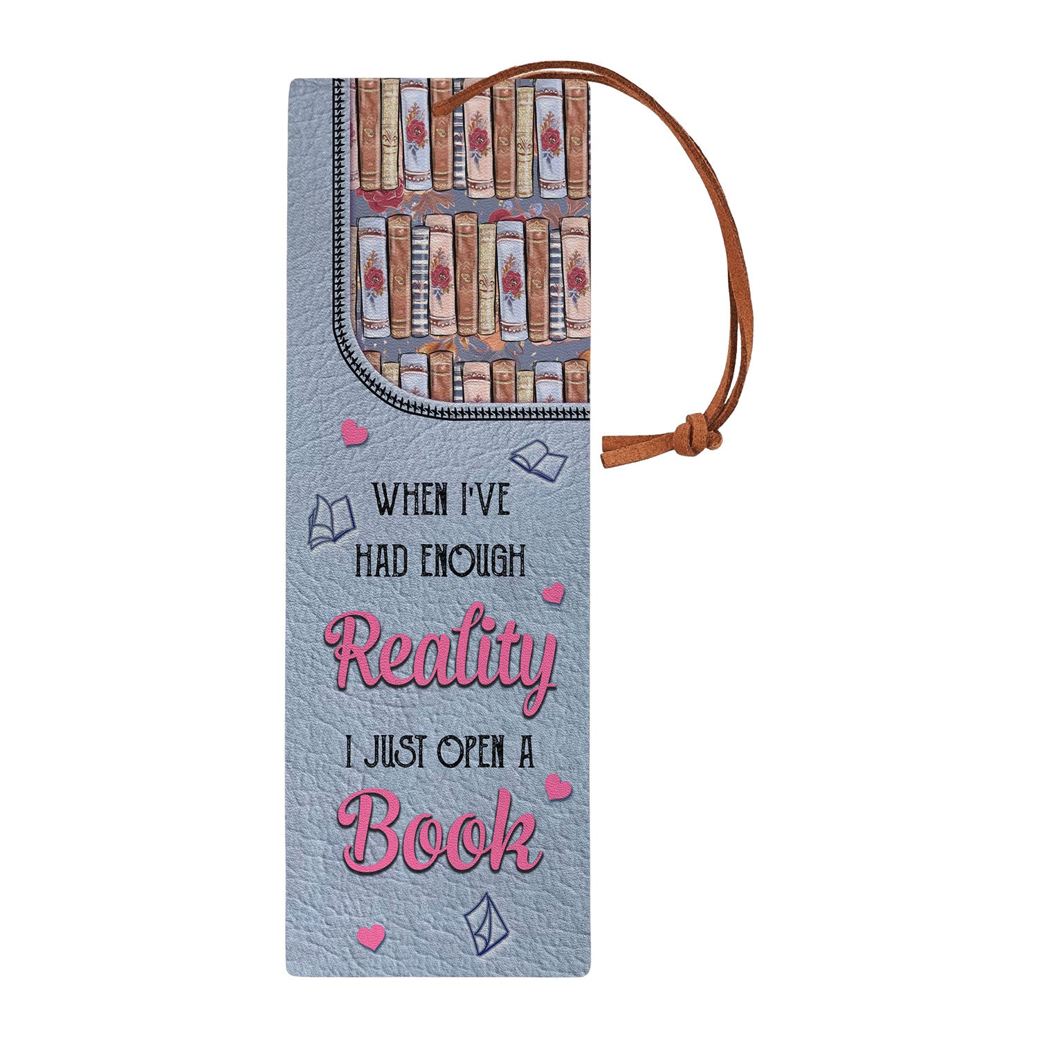 A handmade leather bookmark with “I live in a world created by books” on it. Genuine leather, good weight in the hand, and it sits flat in the pages without leaving marks. The kind of bookmark you actually want to use, not just shove in a drawer.