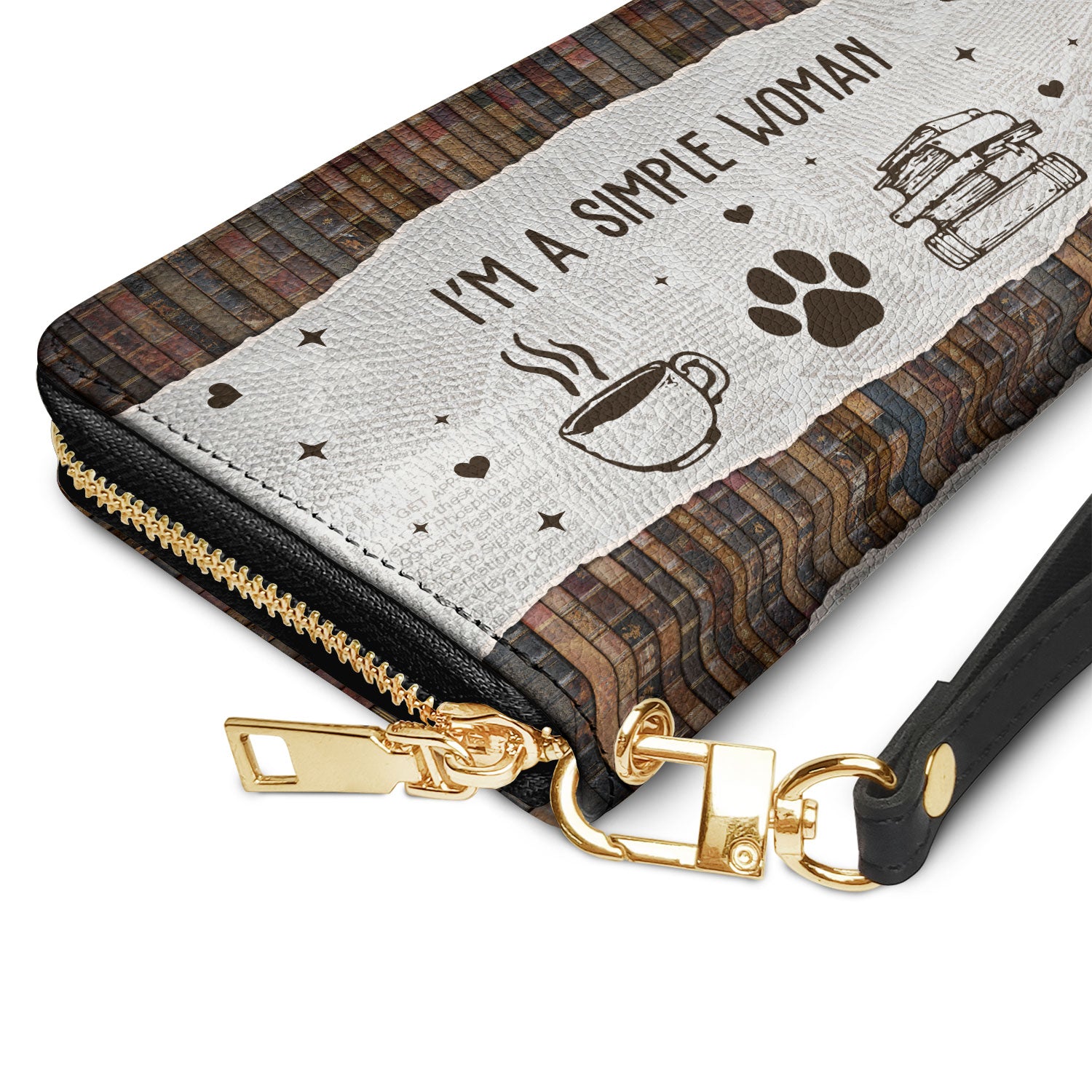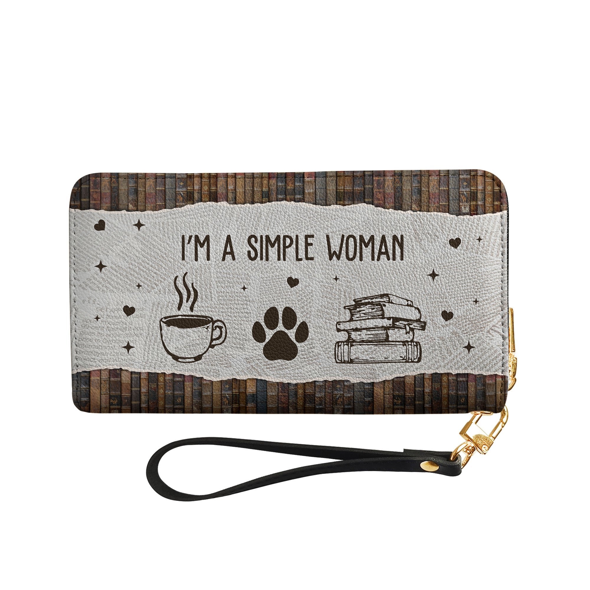 A zip-around leather wallet with “I Am A Simple Woman” on the front. Choose between top grain leather that develops character over time, or premium faux leather that is easy to care for and stays looking fresh.