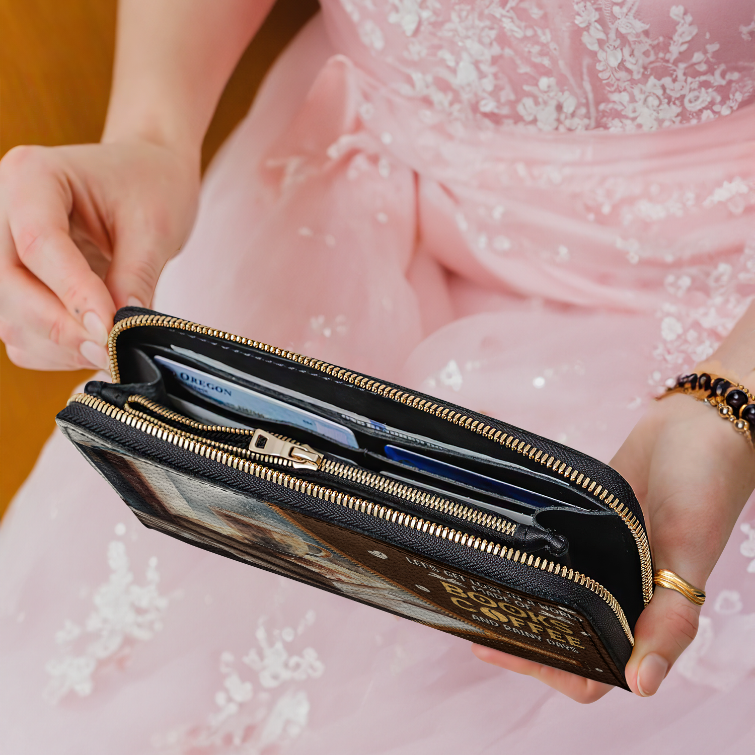 A zip-around leather wallet with “Lets Get Lost In A World Made Of Books Coffee And Rainy Days” on the front. Choose between top grain leather that develops character over time, or premium faux leather that is easy to care for and stays looking fresh.