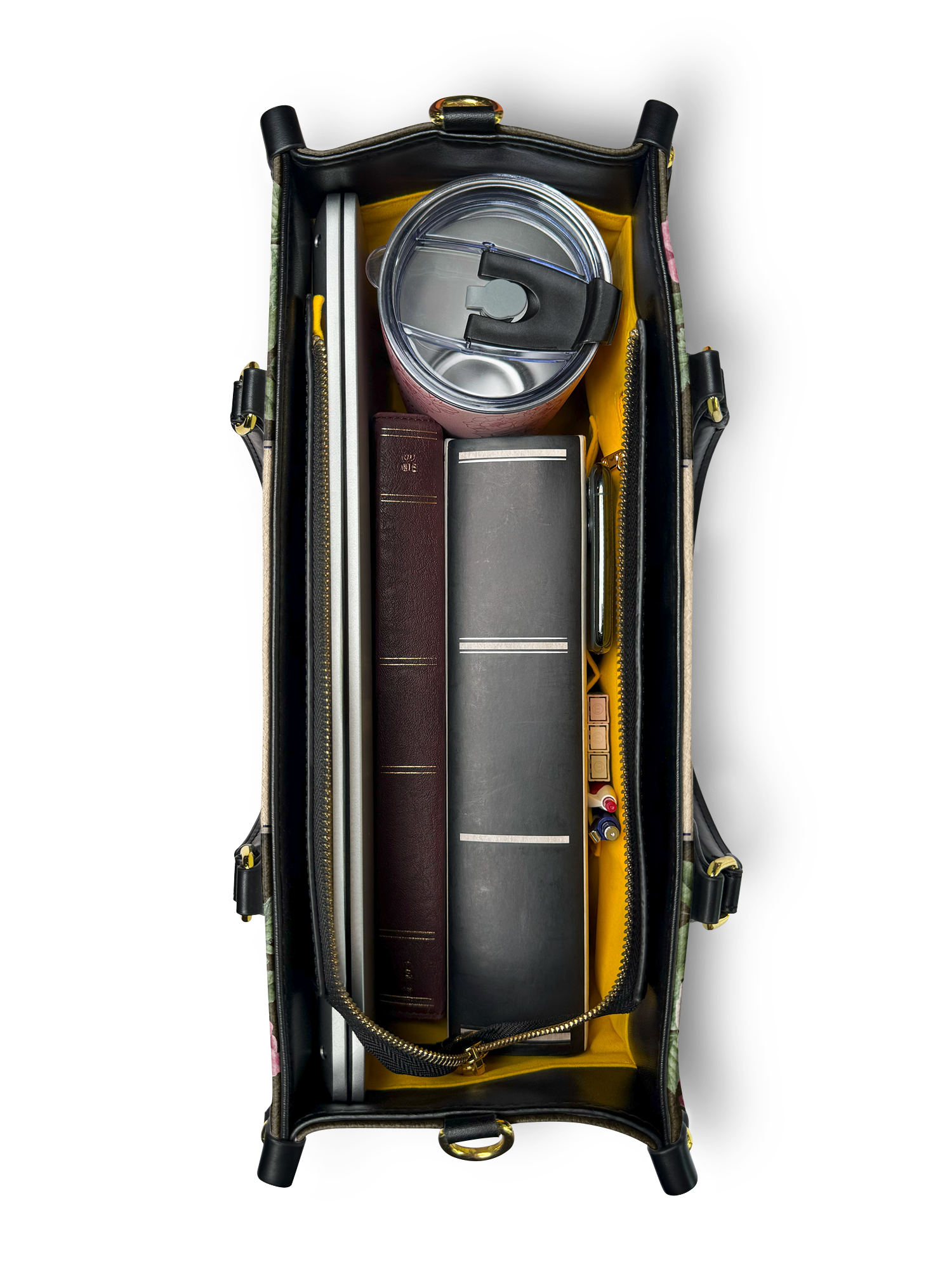 It comes in premium faux leather or top-grain leather, both in Small, Medium, and Large. The leather has a nice grained texture with contrasting color details on both sides. You get shoulder straps and rolled leather top handles, so you can carry it whichever way suits you.
