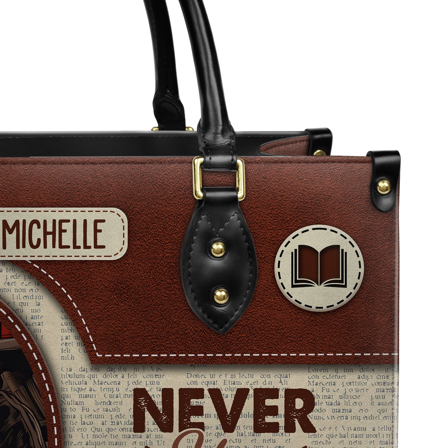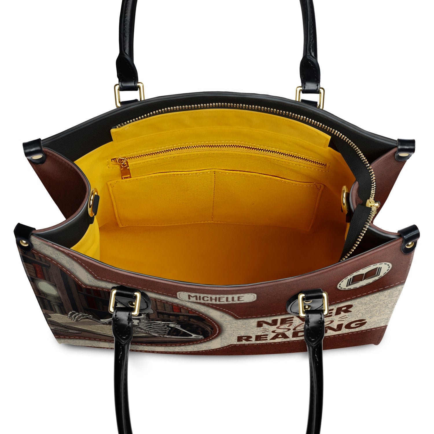 This leather bag has the quote “Never Stop Reading” printed on both sides. If that line makes you smile, you already know this bag is for you.