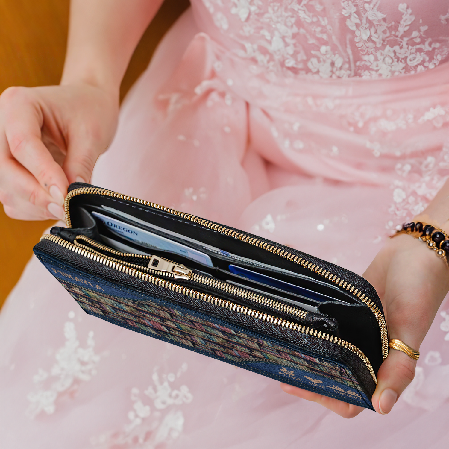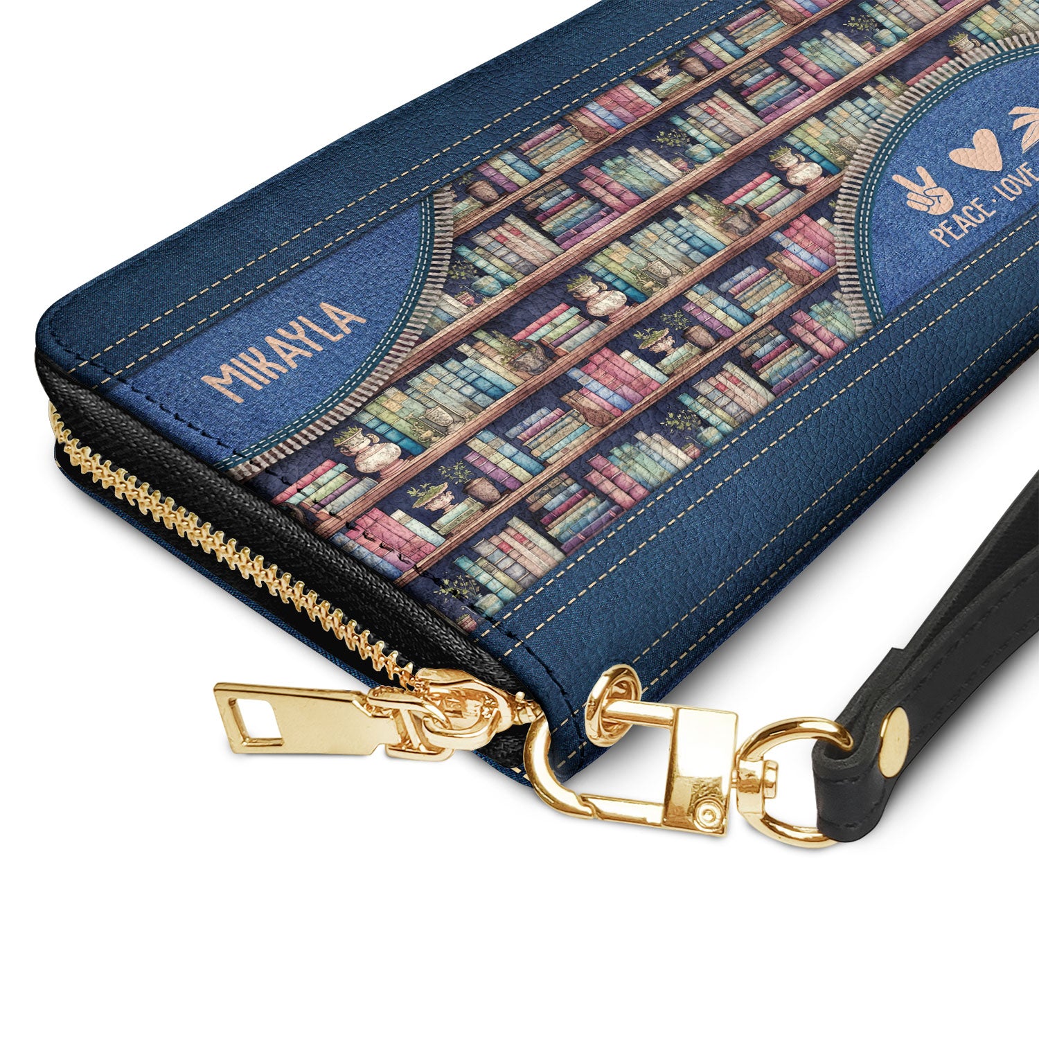 A zip-around leather wallet with “Peace Love Library” on the front. Choose between top grain leather that develops character over time, or premium faux leather that is easy to care for and stays looking fresh.