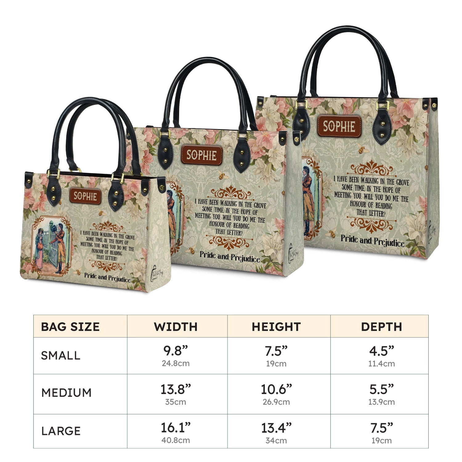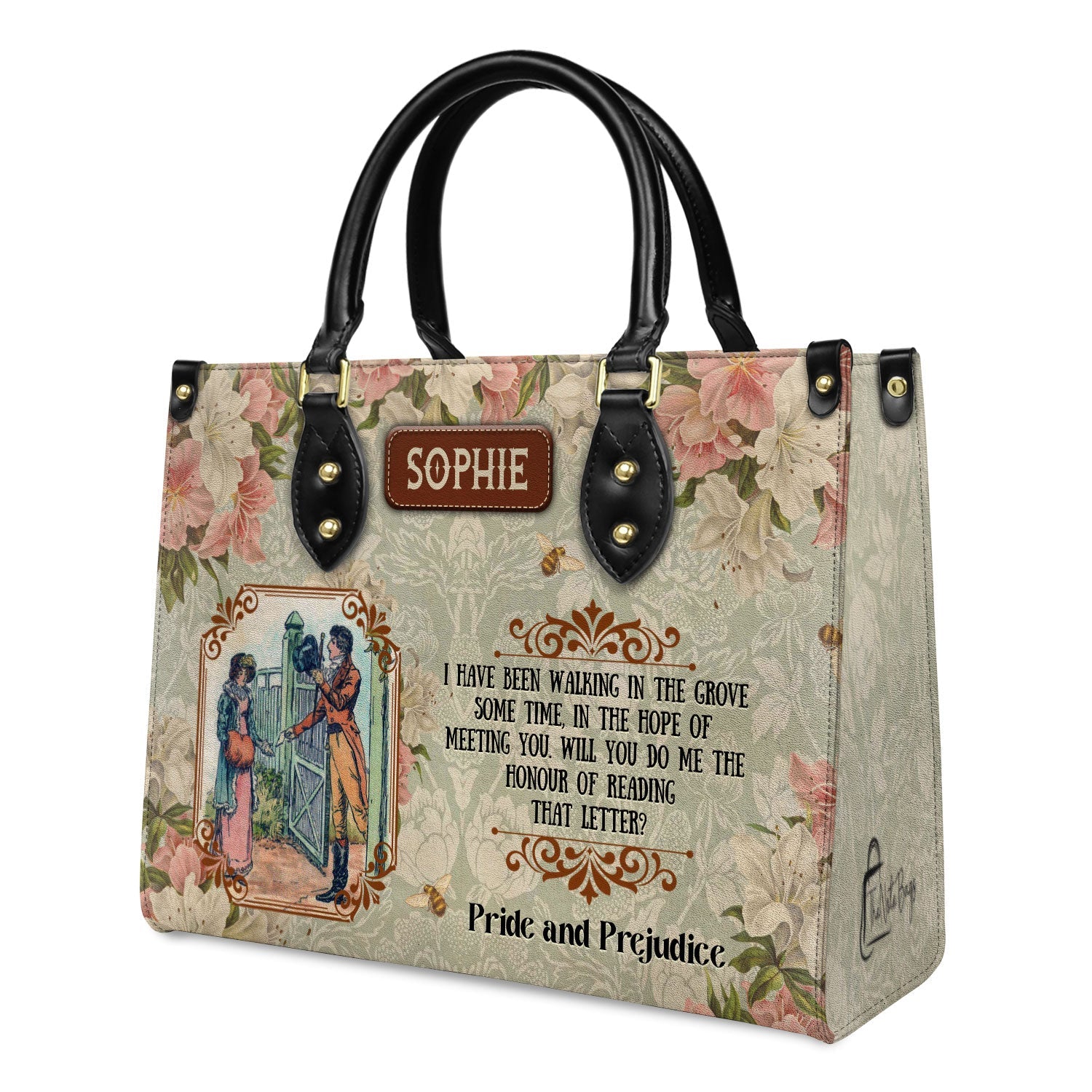 This handmade leather bag carries a quote from Pride and Prejudice by Jane Austen, printed on both sides. The kind of bag that says something about who you are without you having to say a word.