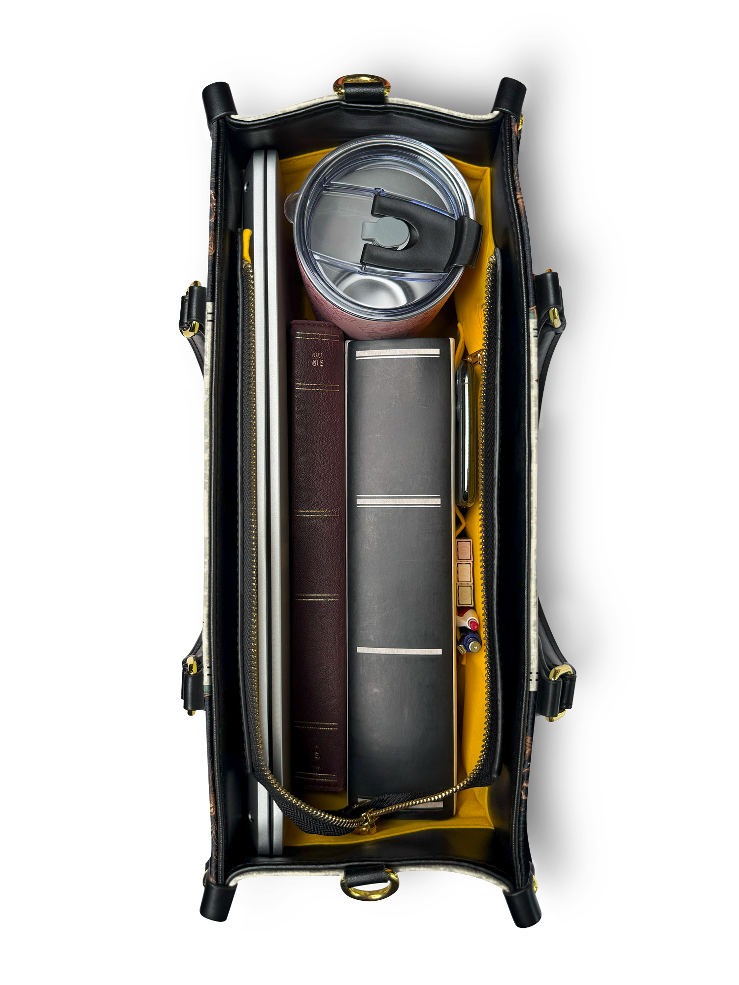 It comes in premium faux leather or top-grain leather, in Small, Medium, and Large. The leather has a grained texture with contrasting color details printed on both sides. You get shoulder straps and rolled leather top handles, so you can carry it however works for you.