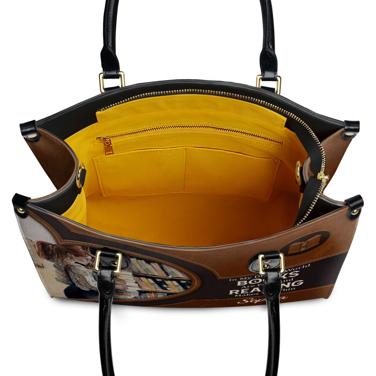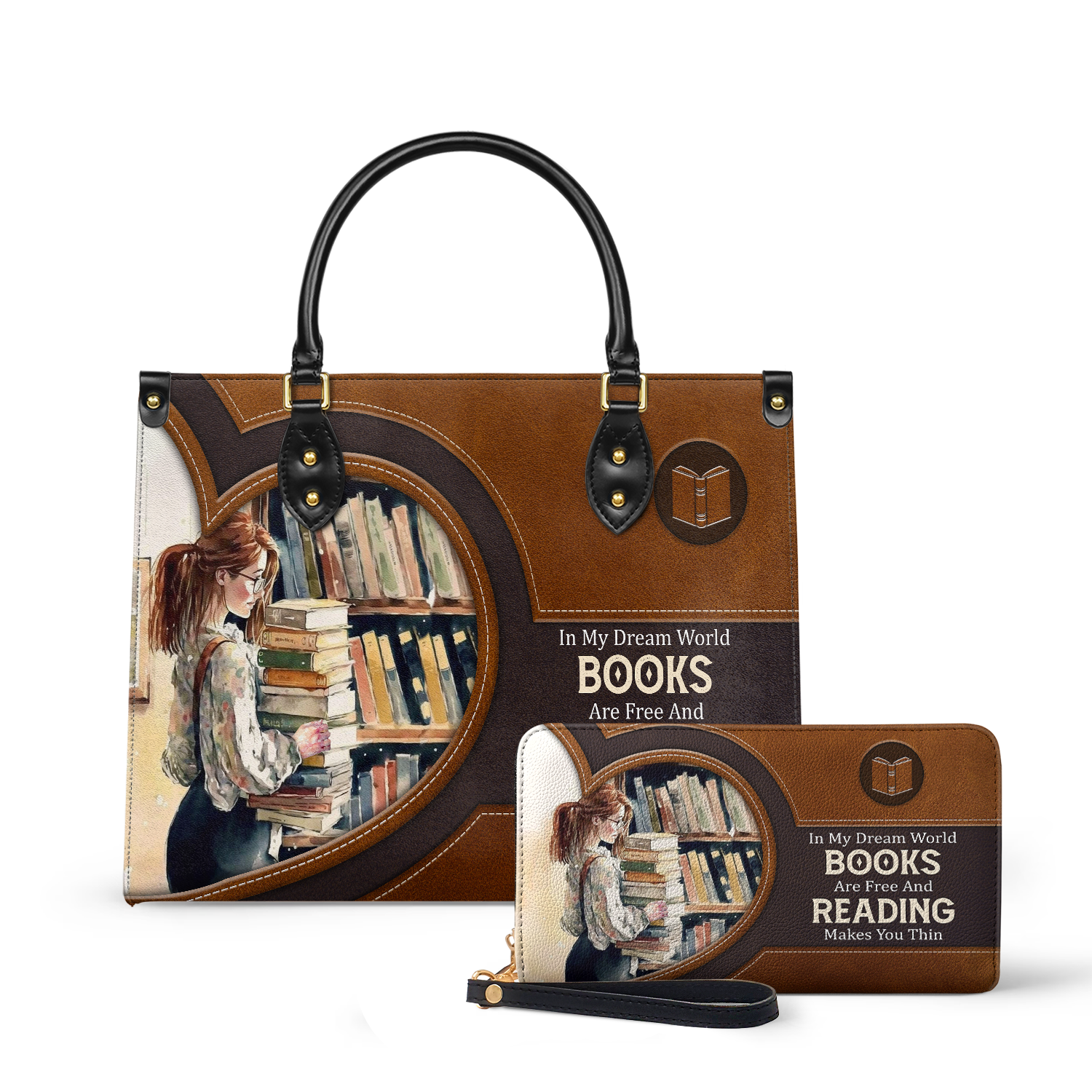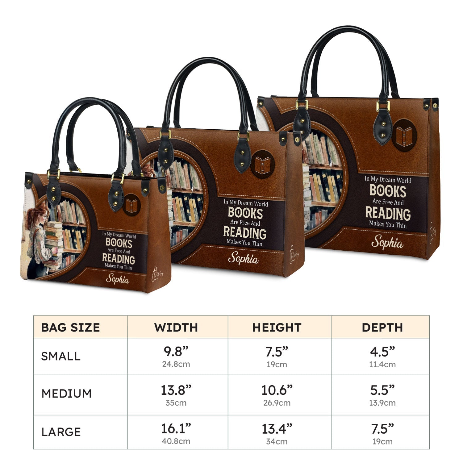 This leather bag has the quote “In my dream world, books are free and reading makes you thin.” printed on both sides. If that line makes you smile, you already know this bag is for you.
