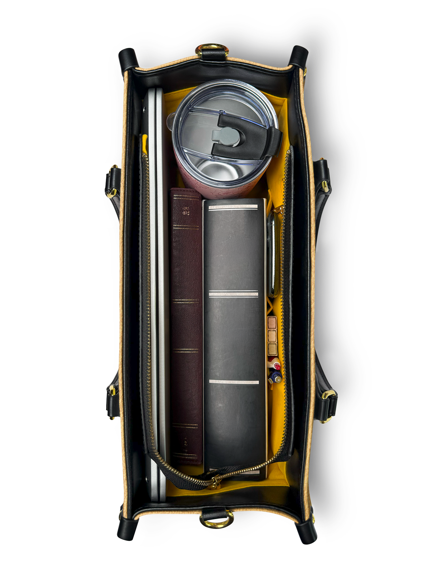 It comes in premium faux leather or top-grain leather, in Small, Medium, and Large. The leather has a grained texture with contrasting color details printed on both sides. You get shoulder straps and rolled leather top handles, so you can carry it however works for you.