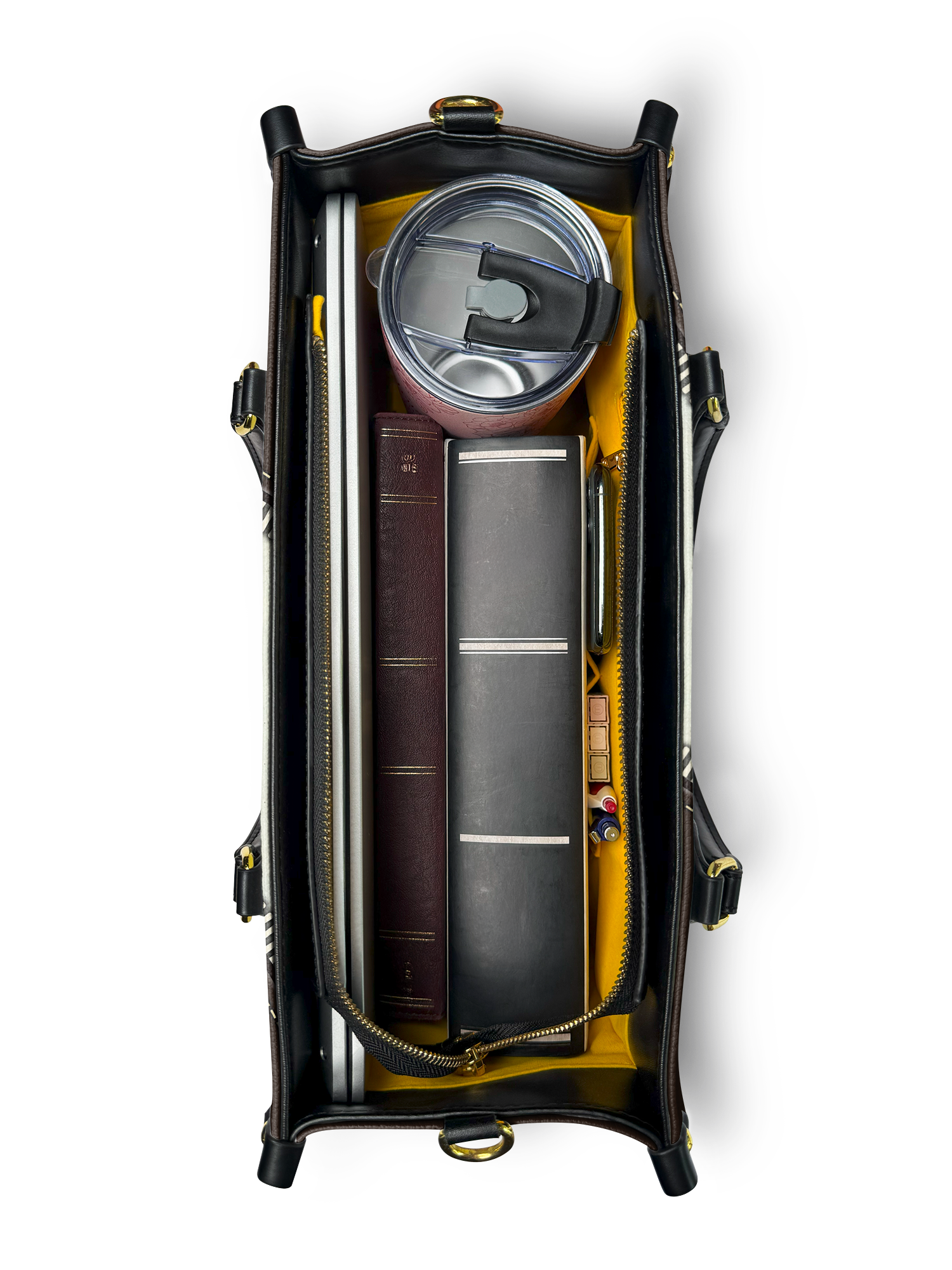It comes in premium faux leather or top-grain leather, in Small, Medium, and Large. The leather has a grained texture with contrasting color details printed on both sides. You get shoulder straps and rolled leather top handles, so you can carry it however works for you.