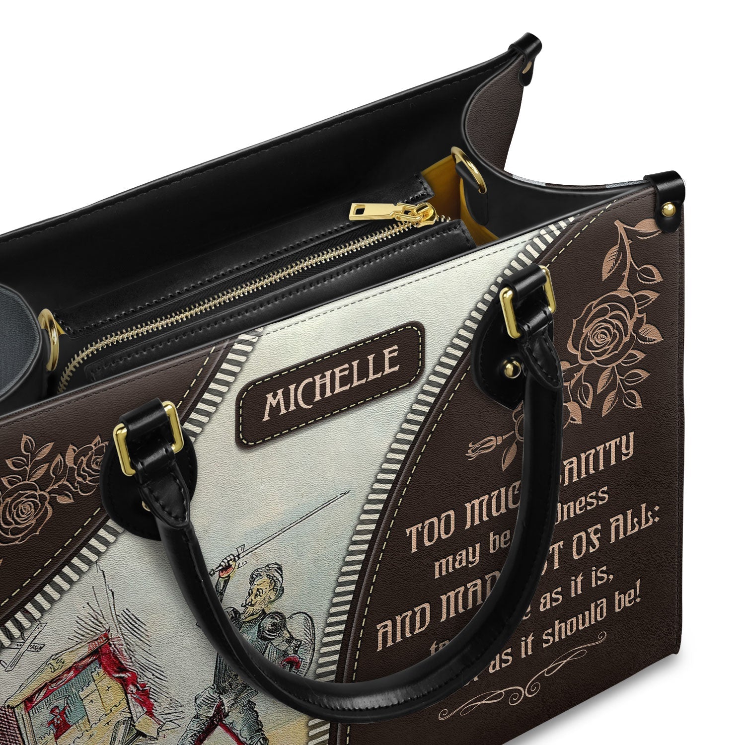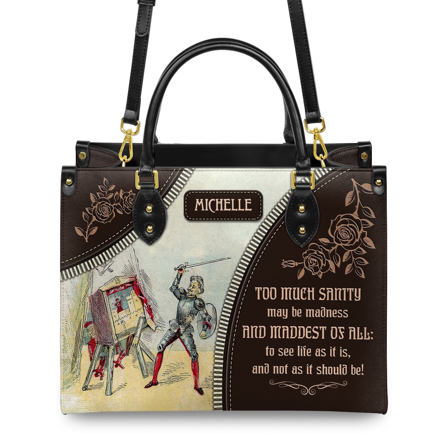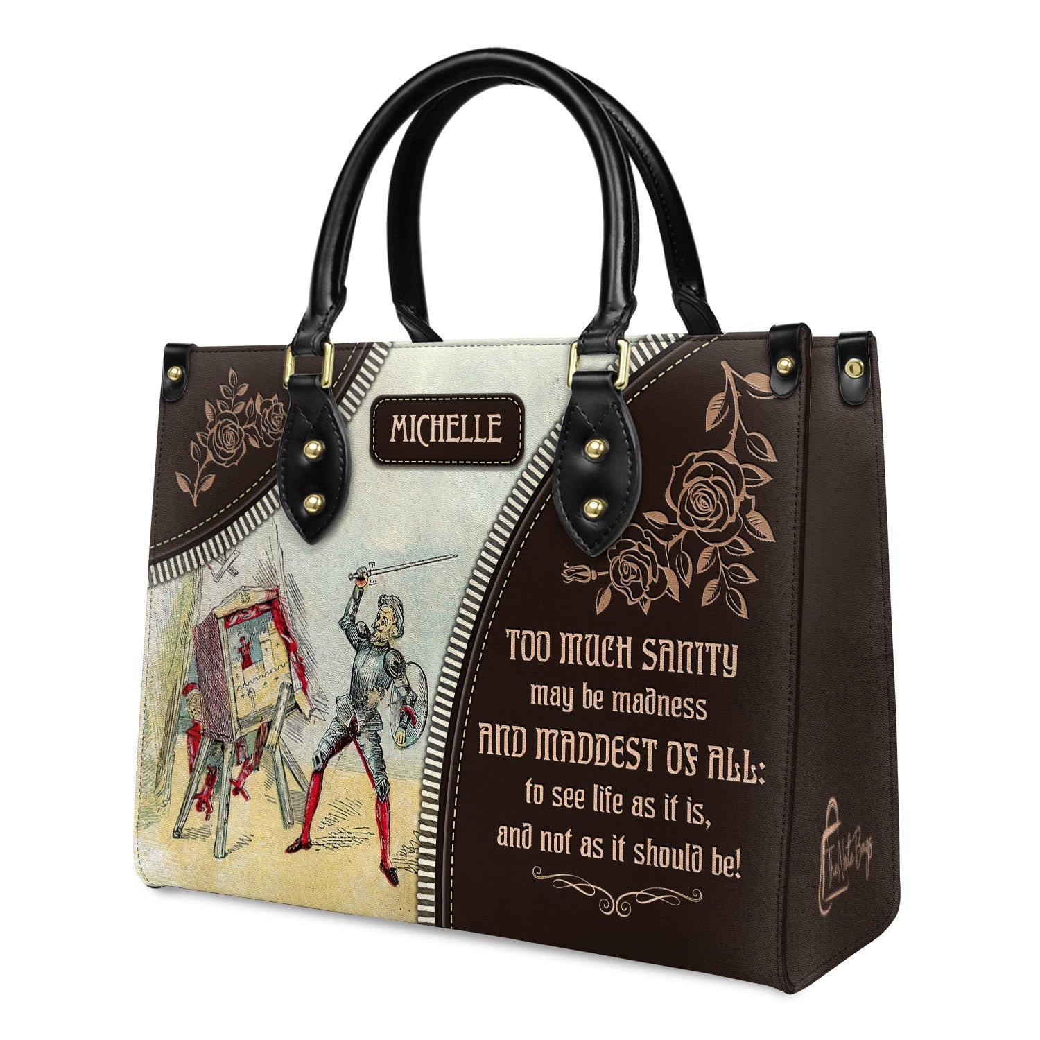 This leather bag features a quote from Don Quixote by Miguel de Cervantes, printed on both sides. If these words mean something to you, this bag was made with you in mind.