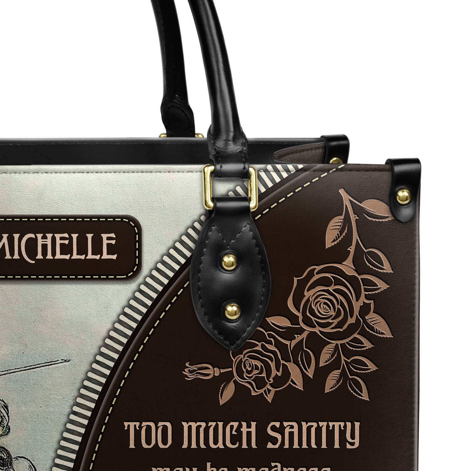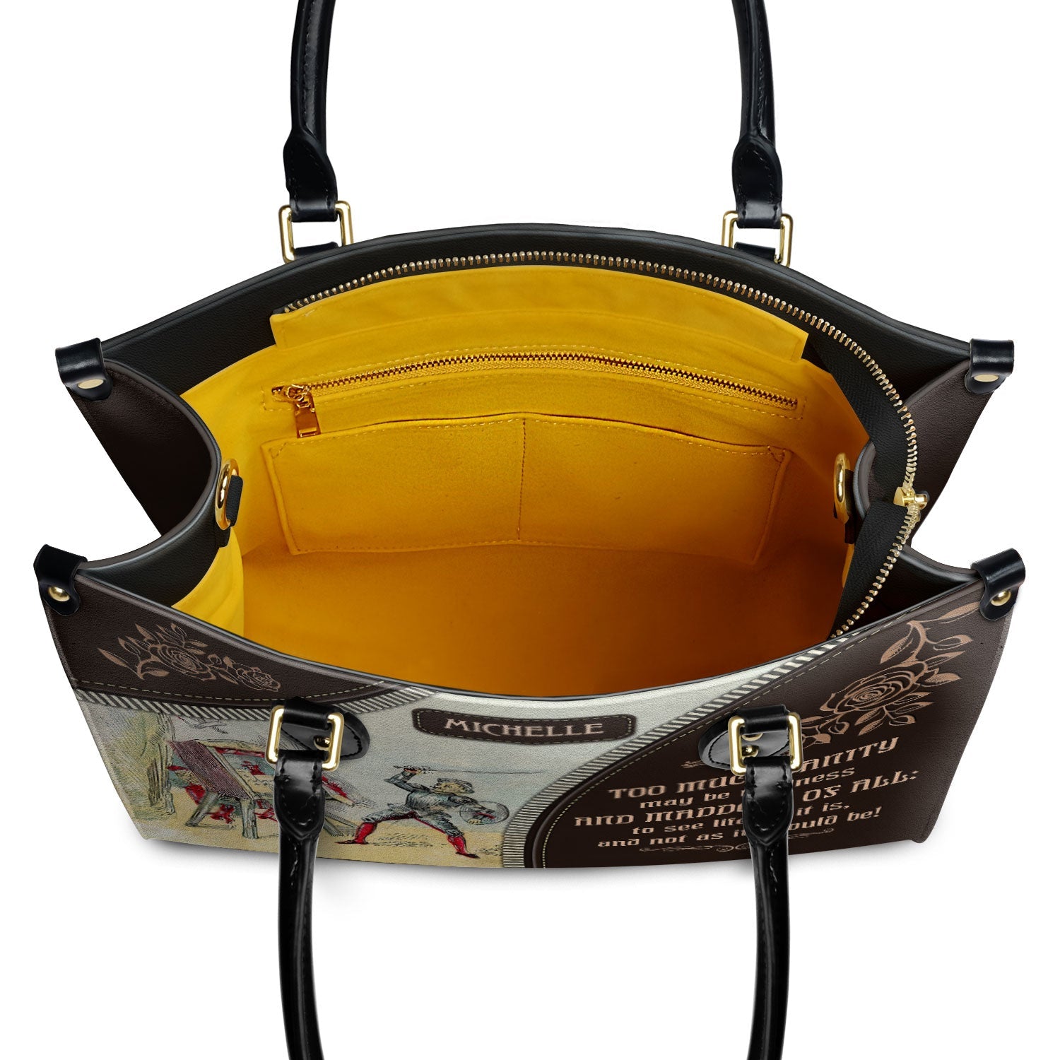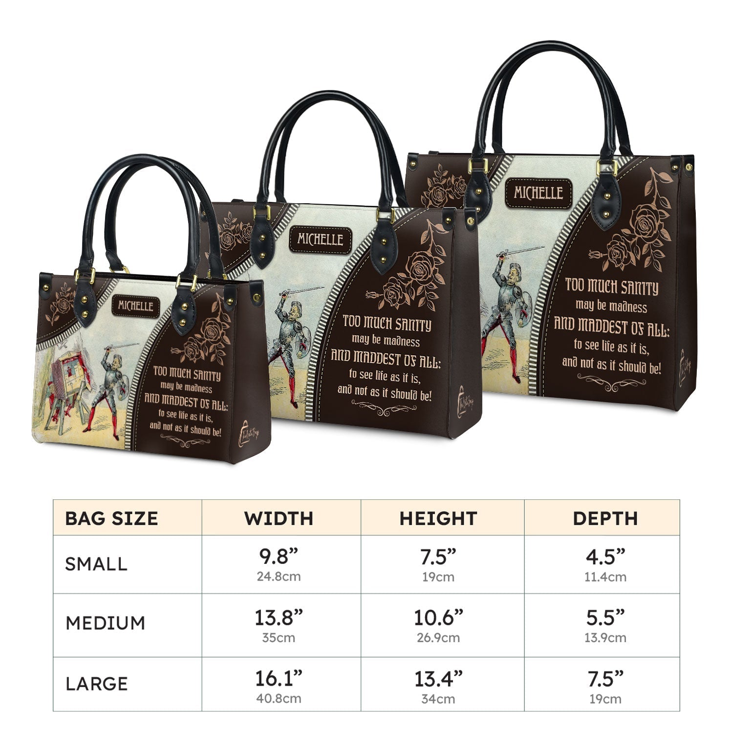 This leather bag features a quote from Don Quixote by Miguel de Cervantes, printed on both sides. If these words mean something to you, this bag was made with you in mind.