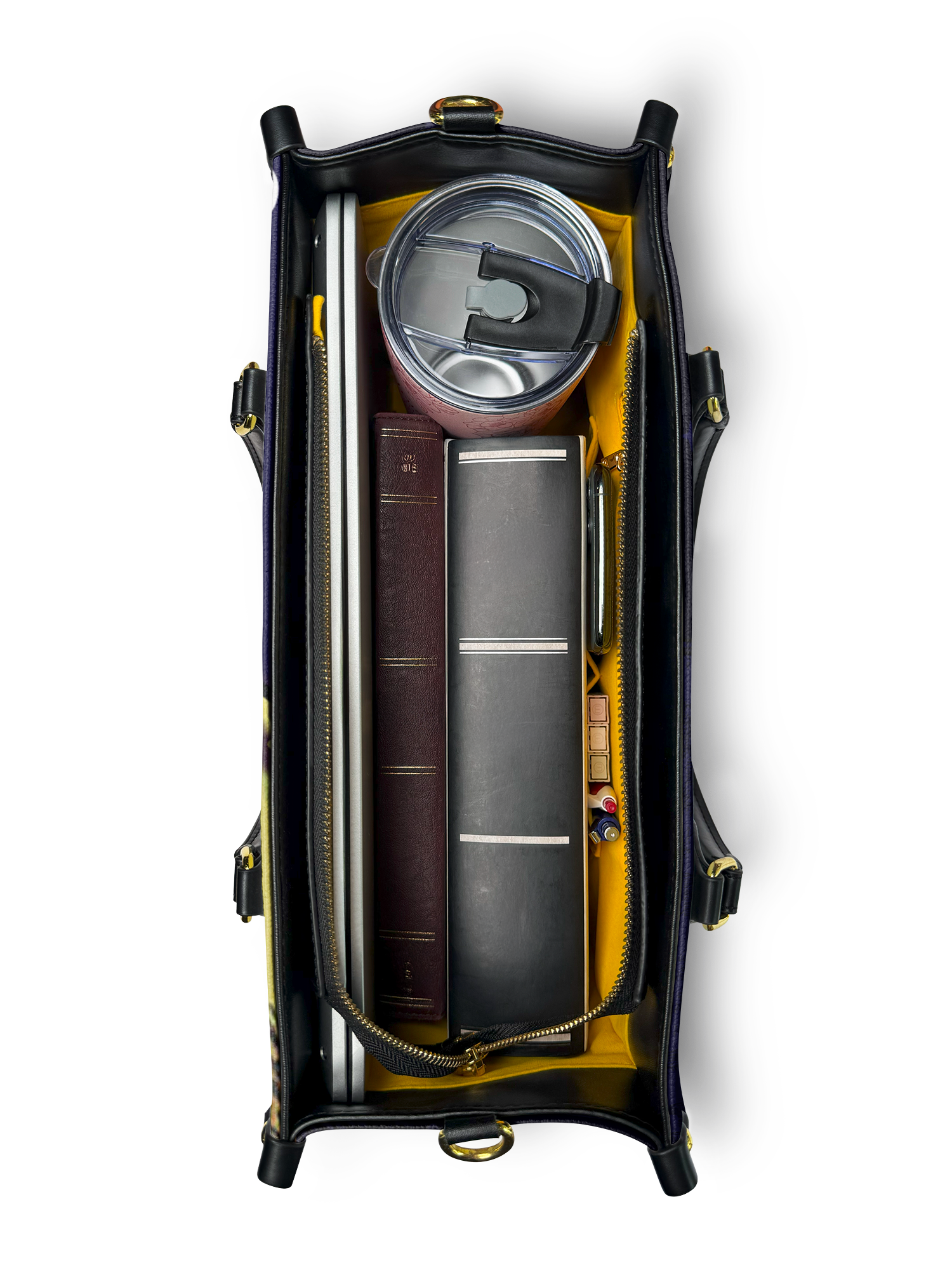 It comes in premium faux leather or top-grain leather, in Small, Medium, and Large. The leather has a grained texture with contrasting color details printed on both sides. You get shoulder straps and rolled leather top handles, so you can carry it however works for you.