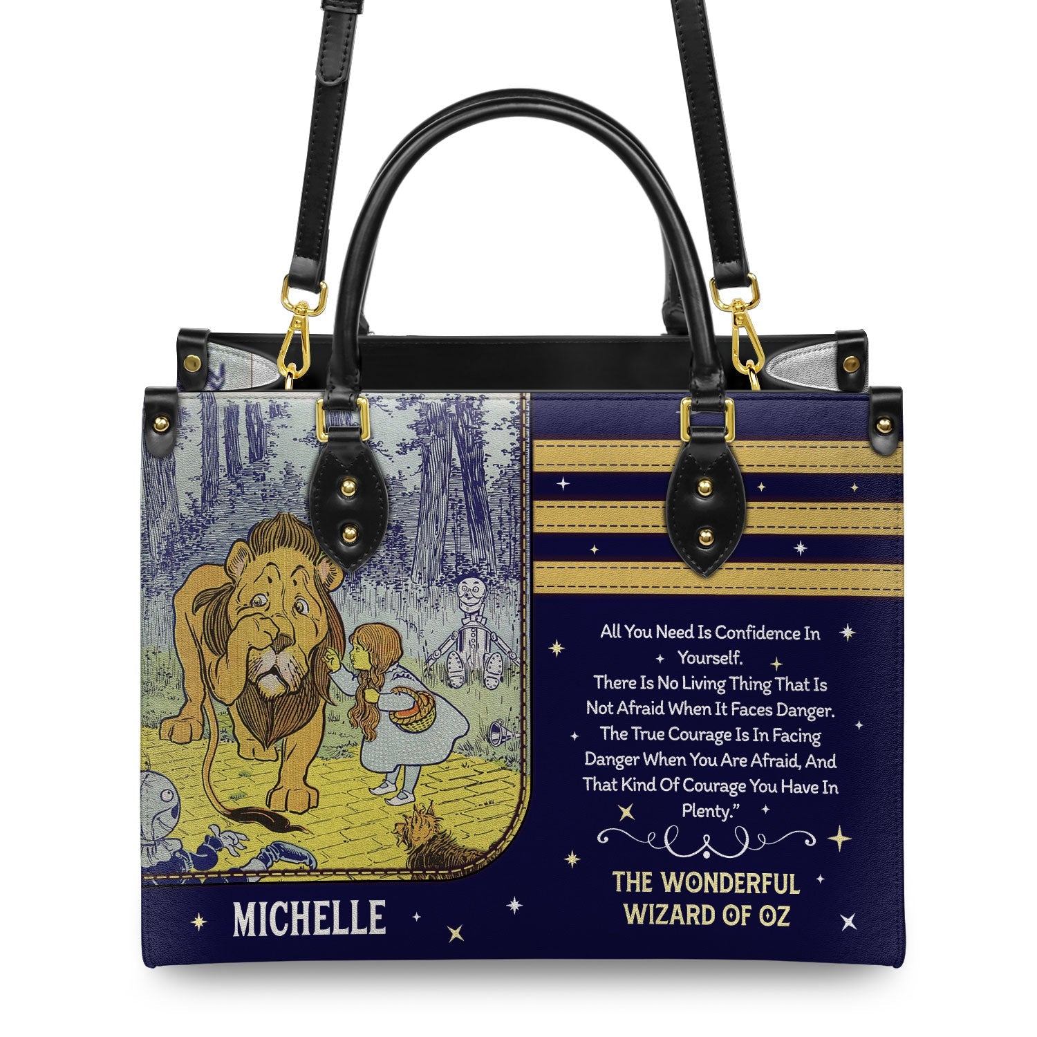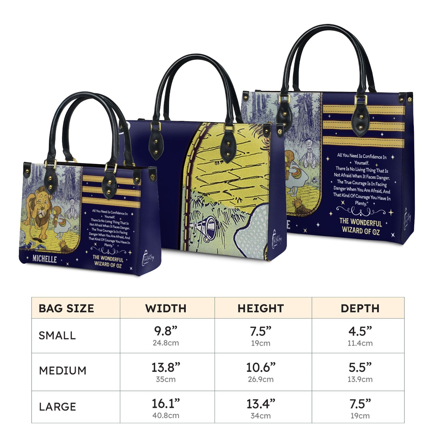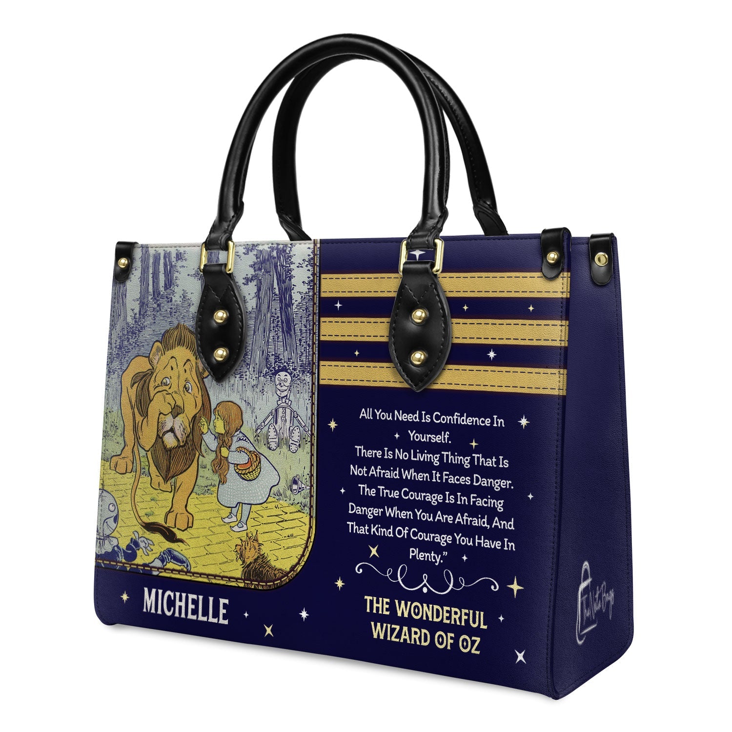 This leather bag features a quote from The Wonderful Wizard of Oz by L. Frank Baum, printed on both sides. If these words mean something to you, this bag was made with you in mind.